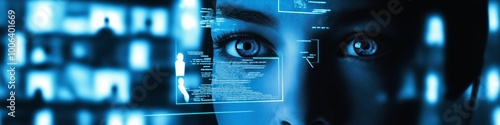 A woman's face is shown in a blue and white background with a computer screen in the background. The woman's eyes are open and staring at the camera. Concept of technology and artificial intelligence