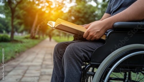 Wheelchair User Finds Peace and Solitude in a Quiet Library Corner, Immersed in a Book Under Soft Light, A Moment of Tranquility and Learning