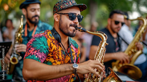 A group of musicians playing lively Latin jazz in a park, with people gathered around, enjoying the music and the festivities.