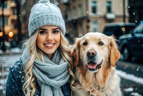 Happy New Year and Merry Christmas! Pets. A woman hugs a retriever dog. A conscious life with pets, the concept of love for animals.