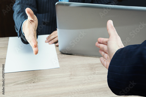 Stretta di mano per firma del contratto dal capo dell'ufficio dopo un colloquio