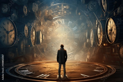 A lone figure gazes into a glowing portal where time seems to bend amidst a backdrop of ornate timeless clocks and mysterious shadows