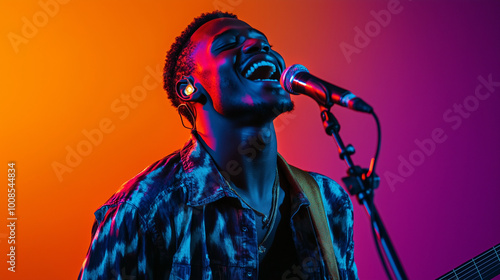 Młody afroamerykański artysta, pełen życia i radości, śpiewa na tle gradientu w odcieniach pomarańczowym i fioletowym, który zdobi studio neonowymi światłami.