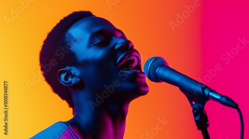 Młody afroamerykański artysta, pełen życia i radości, śpiewa na tle gradientu w odcieniach pomarańczowym i fioletowym, który zdobi studio neonowymi światłami.