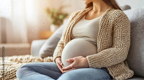 A pregnant woman sitting comfortably on a couch, cradling her baby bump. This conveys a sense of anticipation and maternal love.