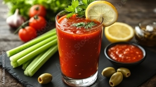 Bloody Mary es un cóctel rojo intenso, servido en un vaso alto y adornado con una rodaja de limón, ramas de apio y hojas de perejil. Está rodeado de ingredientes frescos como tomates, limones, apio y