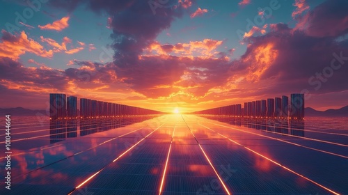 Massive solar-powered data center in a desert, futuristic server towers connected by glowing cables, surrounded by endless PV arrays reflecting the sky