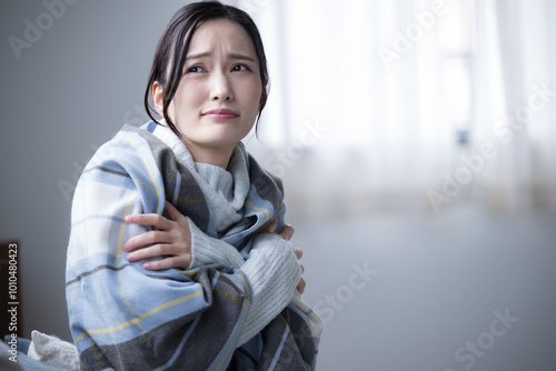 自宅で冬の部屋が寒い大変な女性 風邪や冷え性対策 上半身の見上げるクローズアップ