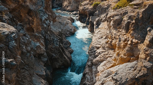 A stunning view of a serene river flowing through rugged cliffs, showcasing the beauty of nature and tranquil water.
