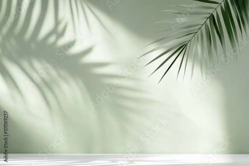 #1401590580 abstract background with palm leaf shadow on a white wall. Minimal summer scene for product presentation, empty mockup.