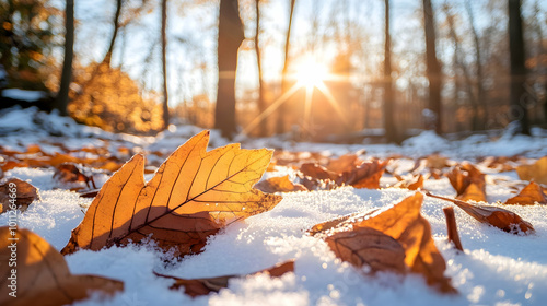 Colorful autumn leaves with first winter snow in the forest. Concept of winter coming and autumn leaving.