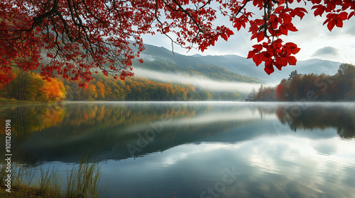 Przy jeziorze rozciąga się niezwykły widok na jesienny krajobraz, gdzie czerwone liście pięknie kontrastują z poranną mgłą spowijającą góry w tle.