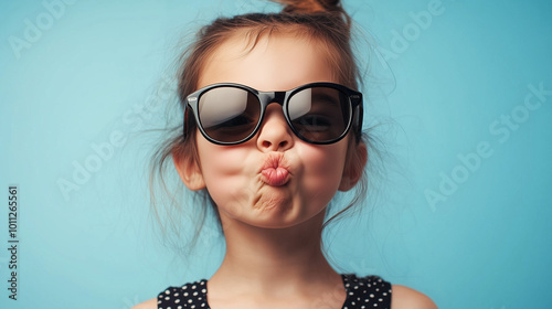 Urocza dziewczyna w kolorowych okularach przeciwsłonecznych robi zabawną minę, która rozbawia wszystkich wokół.