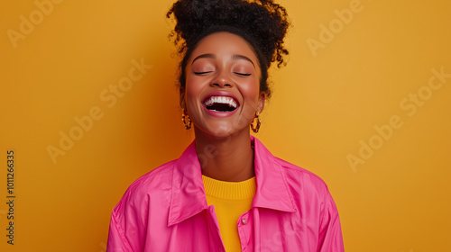 Radosna afroamerykańska kobieta w kolorowych różowych ubraniach śmieje się z pełną radością, zarażając optymizmem wszystkich wokół.