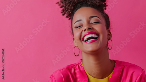 Radosna afroamerykańska kobieta w kolorowych różowych ubraniach śmieje się z pełną radością, zarażając optymizmem wszystkich wokół.