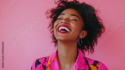 Radosna afroamerykańska kobieta w kolorowych różowych ubraniach śmieje się z pełną radością, zarażając optymizmem wszystkich wokół.