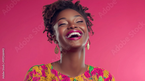 Radosna afroamerykańska kobieta w kolorowych różowych ubraniach śmieje się z pełną radością, zarażając optymizmem wszystkich wokół.