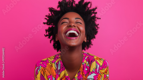Radosna afroamerykańska kobieta w kolorowych różowych ubraniach śmieje się z pełną radością, zarażając optymizmem wszystkich wokół.