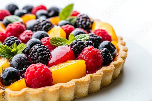 This image captures a mixed berry tart topped with colorful, fresh fruits and a crisp crust, representing joy, celebration, and the art of gourmet cuisine.