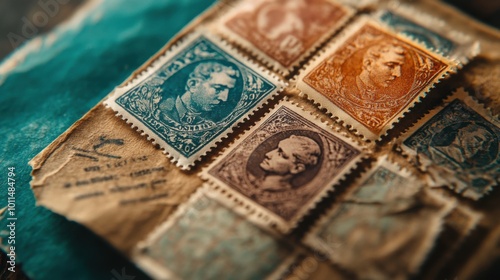 Macro shot of rare stamps from the early 20th century, focusing on the perforations and color details, placed on an old envelope.