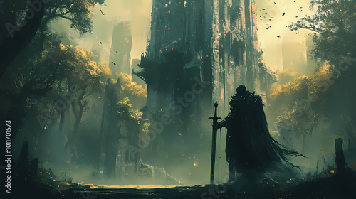 Towering dark necromancer brandishing ornate greatsword in haunted woodland glen. Dark Wizard's Tower. Illustration