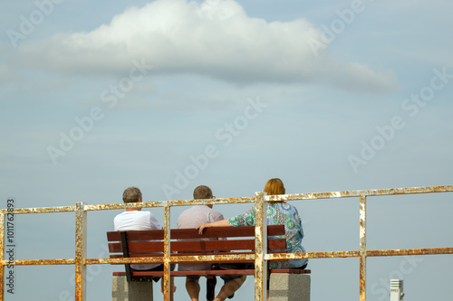 Troje ludzi siedzących na ławce patrzących na chmury na błękitnym niebie.