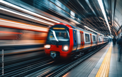A fast-moving subway train captured with a long exposure, creating dynamic light trails and a sense of speed. The image emphasizes urban motion and modern transportation.