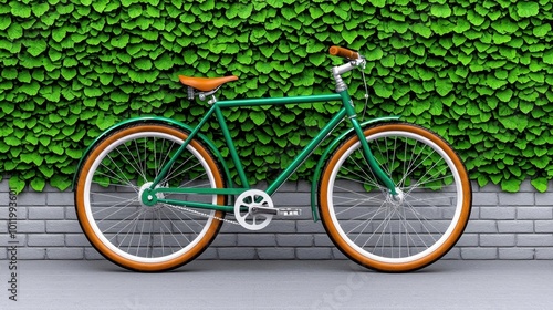 A photostock image of a classic vintage bicycle leaning against a rustic brick wall with ivy growing over it