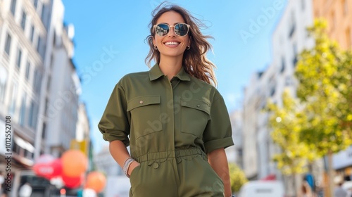 A fashionable woman wearing sunglasses and an olive green outfit walks confidently down a bustling city street, embodying modern urban elegance and style.