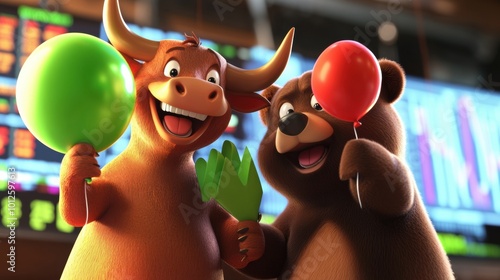 Energetic bull and cautious bear celebrate stock market trends with balloons in vibrant financial trading scene, boosting investor enthusiasm.