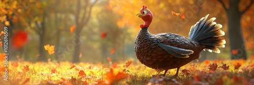 3D animated cartoon turkey in autumn woods