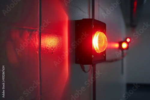 A bright red warning light installation on a metal wall emphasizing safety, alertness and caution in the work environment. AI generate