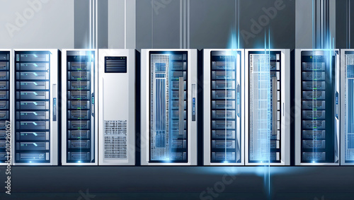 データセンターのサーバーラックが整然と管理された最新インフラの一部を示す。生成AI