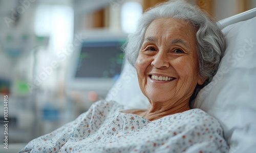 An elderly patient smiling while lying in a hospital bed, depicting a healthcare concept. Ai illustration, Generative AI
