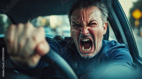 A raging individual, caught in the middle of an intense road rage incident, shouting and pointing aggressively at another driver, their face twisted with fury