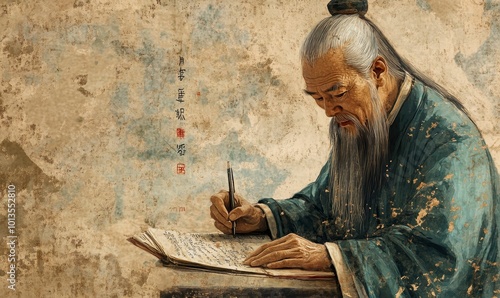 An old man with a beard writes in a book.