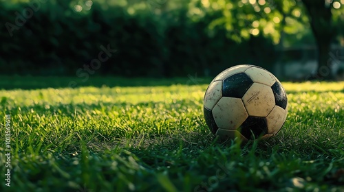 Dirty soccer ball on the grass. Soccer ball on a green lawn.