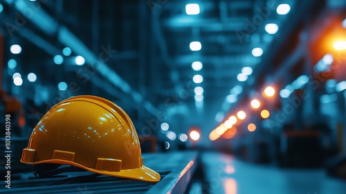 Close-up of a yellow safety helmet on a conveyor belt in a modern industrial facility.