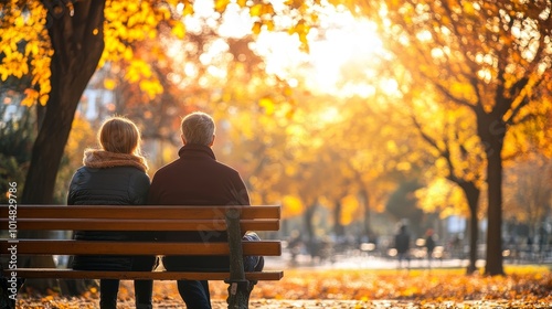 A couple sits on a bench in an autumn park, surrounded by vibrant fall foliage and warm sunlight.