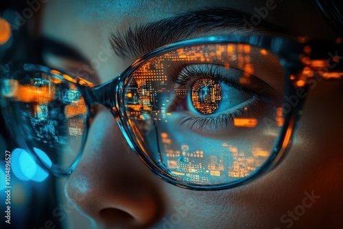 closeup of intense eyes behind glasses reflecting a digital world of technology and cyber security conveying focus and determination in a modern context