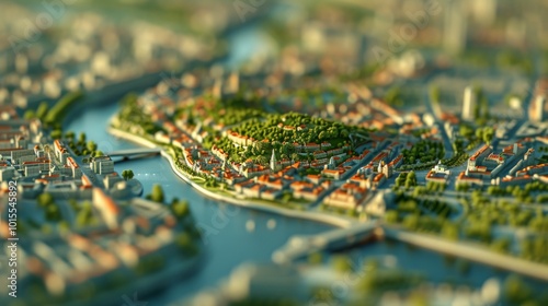 Aerial cityscape captured with tilt-shift technique, showcasing a vibrant urban area with a lush green park and river. The miniature effect highlights buildings, streets, and greenery, offering a