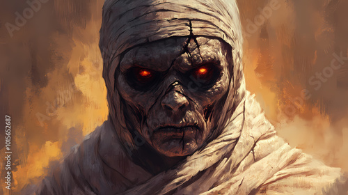Fearsome mummy portrayed in full detail, embodied terror with malevolent eyes. Undead Pharaoh. Illustration