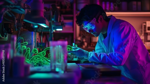 Scientist in Lab with Neon Lights Examining Plant Samples
