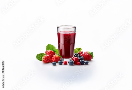 A glass of red juice with fresh berries scattered around the base on a white background.