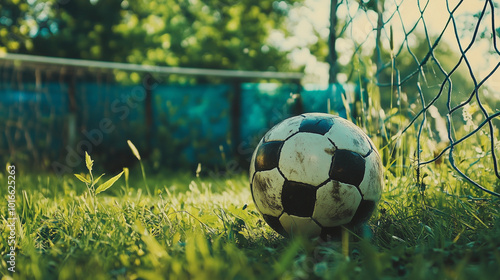 Czarno biała piłka nożna zatrzymuje się w gęsto splecionej siatce bramki, a w tle widoczne jest zielone boisko.