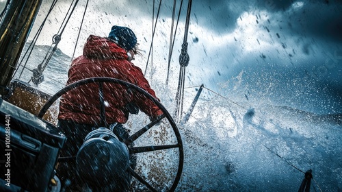 A sailor grips the wheel of his boat, braving the elements as water splashes over the bow and the storm rages around him.