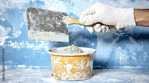 Mixing Trowel: A gloved hand wields a trowel, blending cement within a small container. The circular motion ensures consistency.