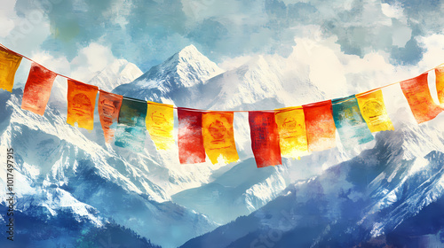 Tibetan prayer flags against snowy mountains, serene and hopeful, digital painting, spiritual symbols. Tibetan Prayer Flags. Illustration