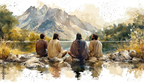 Jesus teaching disciples by a serene lakeside with mountains in the background, peaceful and reflective scene Generative AI