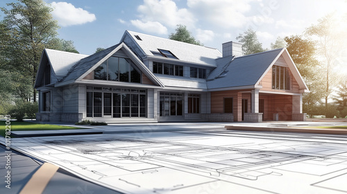 Plany architektoniczne leżą na stole roboczym, a w tle widać wznoszący się budynek.